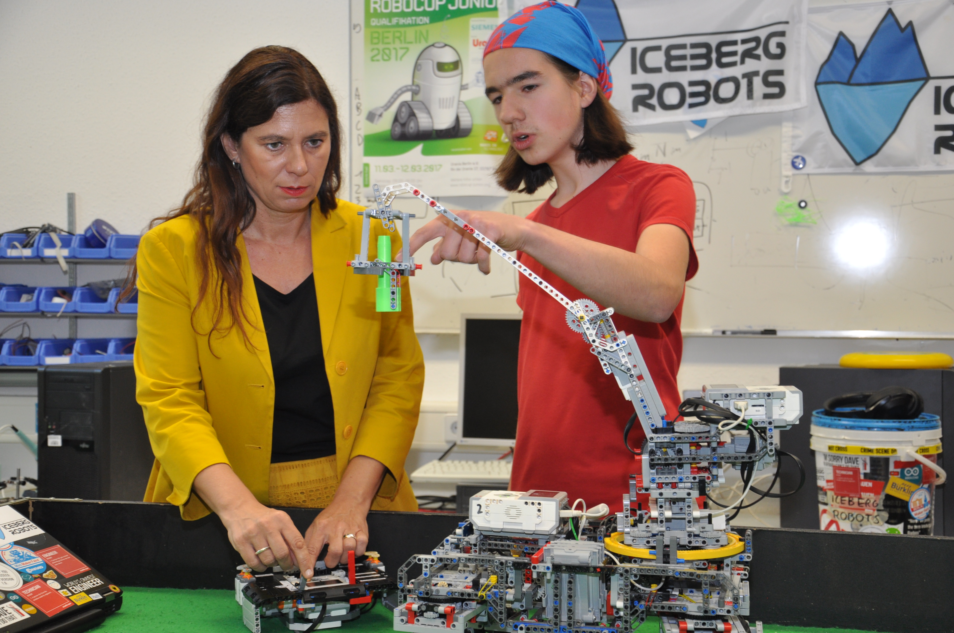 Die Senatroin beendete Ihren Schulbesuch in der Robotik-Werkstatt des KKG. Dort stellten u.a. Schüler des Teams „Iceberg Robots“ ihre selbst konstruierten Fußballroboter vor, mit denen sie sich in diesem Jahr den dritten Platz beim Deutschen RoboCup in Magdeburg und anschließend den zweiten Platz im Europawettbewerb in Italien sicherten.