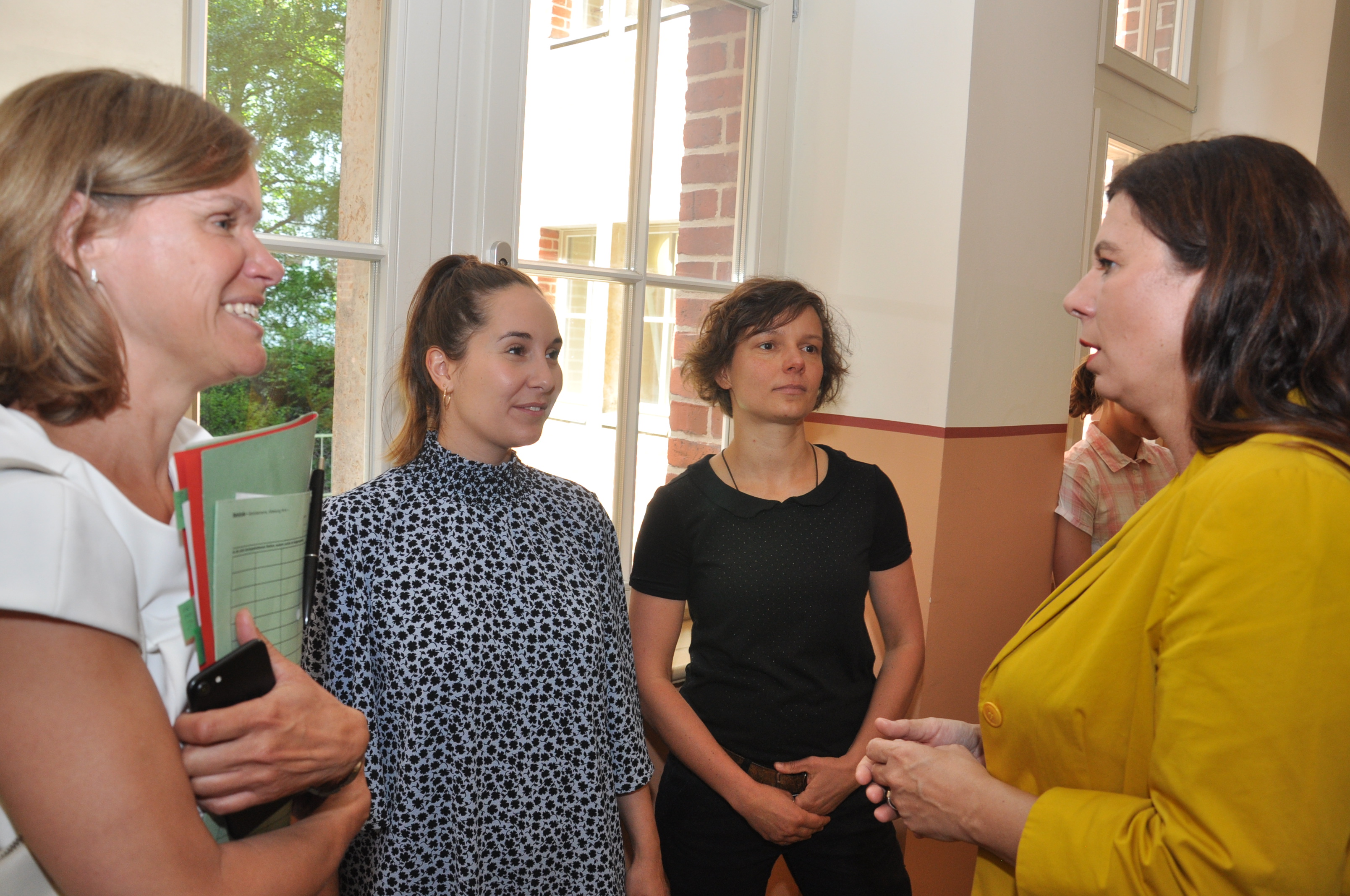 Am 23.05.2018 besuchte Frau Sandra Scheeres, Senatorin für Bildung, Jugend und Familie, unsere Schule. In einer entspannten Gesprächsrunde mit einem multiprofessionellen Team von Schüler_innen, Eltern, Sozialpädagogin, Sonderpädagogin und Lehrer_innen des KKG zeigte sich Frau Scheeres vom mathematisch-naturwissenschaftlichen Profil unserer Schule, der gelebten Inklusion im offenen Ganztag, zu der auch die Begabungs- und Begabtenförderung gehört, der umfassenden Mädchenförderung und den vielfältigen Ganztagsangeboten sehr beeindruckt.