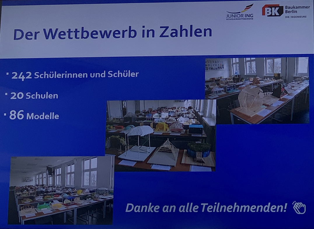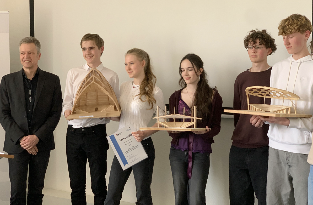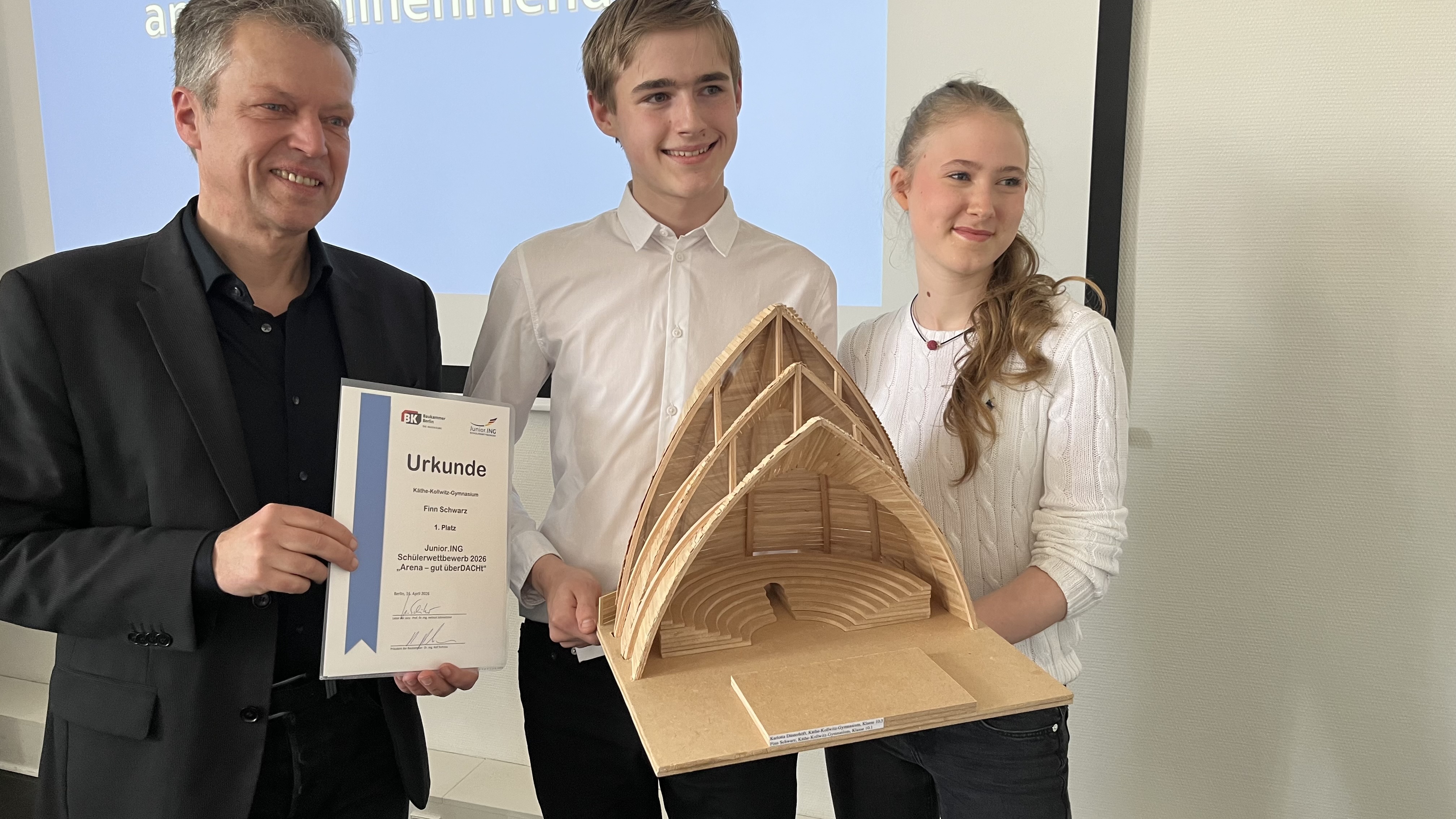 Karlotta Düsterhöft (10.3) und Finn Schwarz (10.1) haben beim Landeswettbewerb Junior.ING der Baukammer Berlin in der Altersklasse 2 (ab 10. Klasse) den 1. Platz belegt. Mit ihrem Modell „Schalenwerk“ werden sie Berlin am 13. Juni beim Bundesfinale im Technik-Museum vertreten. Das KKG war noch mit zwei weiteren, ebenfalls sehr gelungenen Modellen im Wettbewerb vertreten: Vasilii Beliaev und Henri Jungclaussen (8.2) in der Altersklasse 1, Julika Mohs, Nella Nowak, Paula Scharnefsky, Carl Wegener und Alwin Ettner (10.3) in der Altersklasse 2.