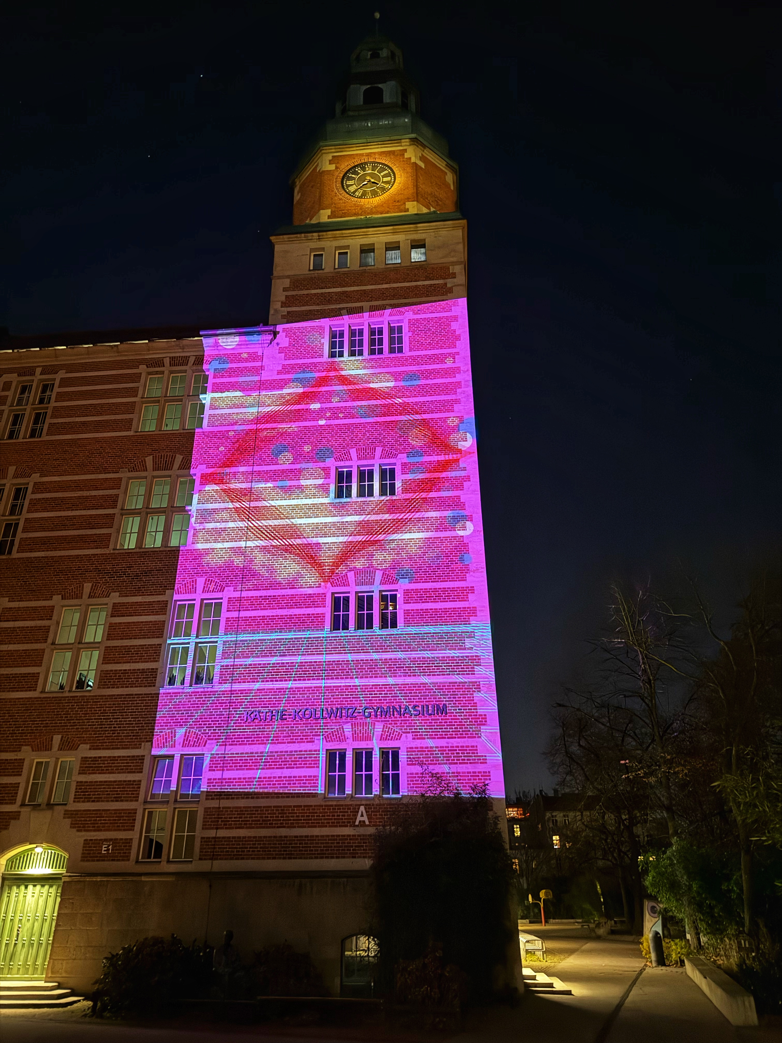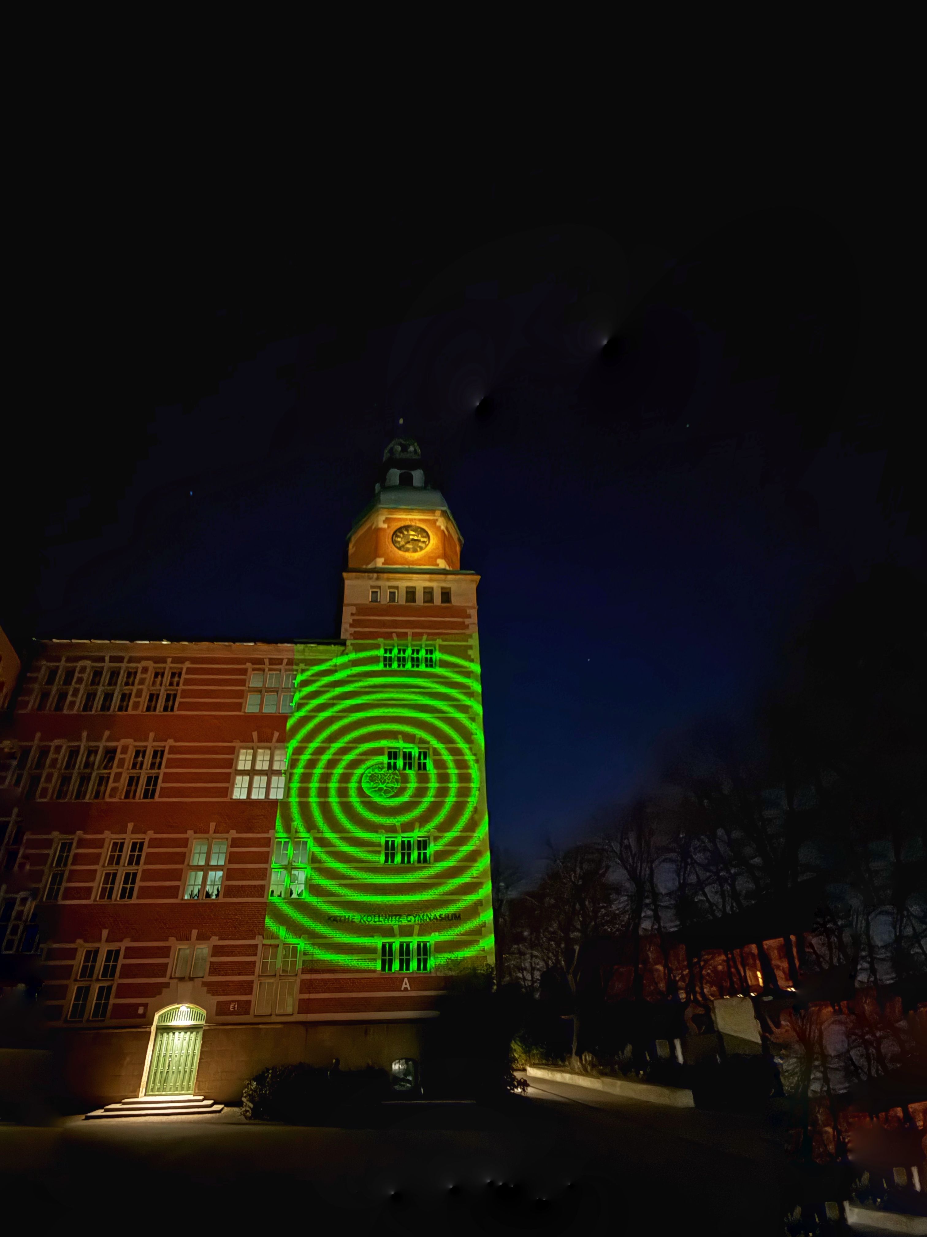 Eine „Festival der Lichter“ am Käthe Kollwitz Gymnasium! Seit gestern Abend erleuchtet die Fassade des Käthe Kollwitz Gymnasiums in bunten, vielfältigen Farben und zeigt Kurzfilme von Schülerinnen aus dem Wahlpflichtunterricht Kunstklasse 10.