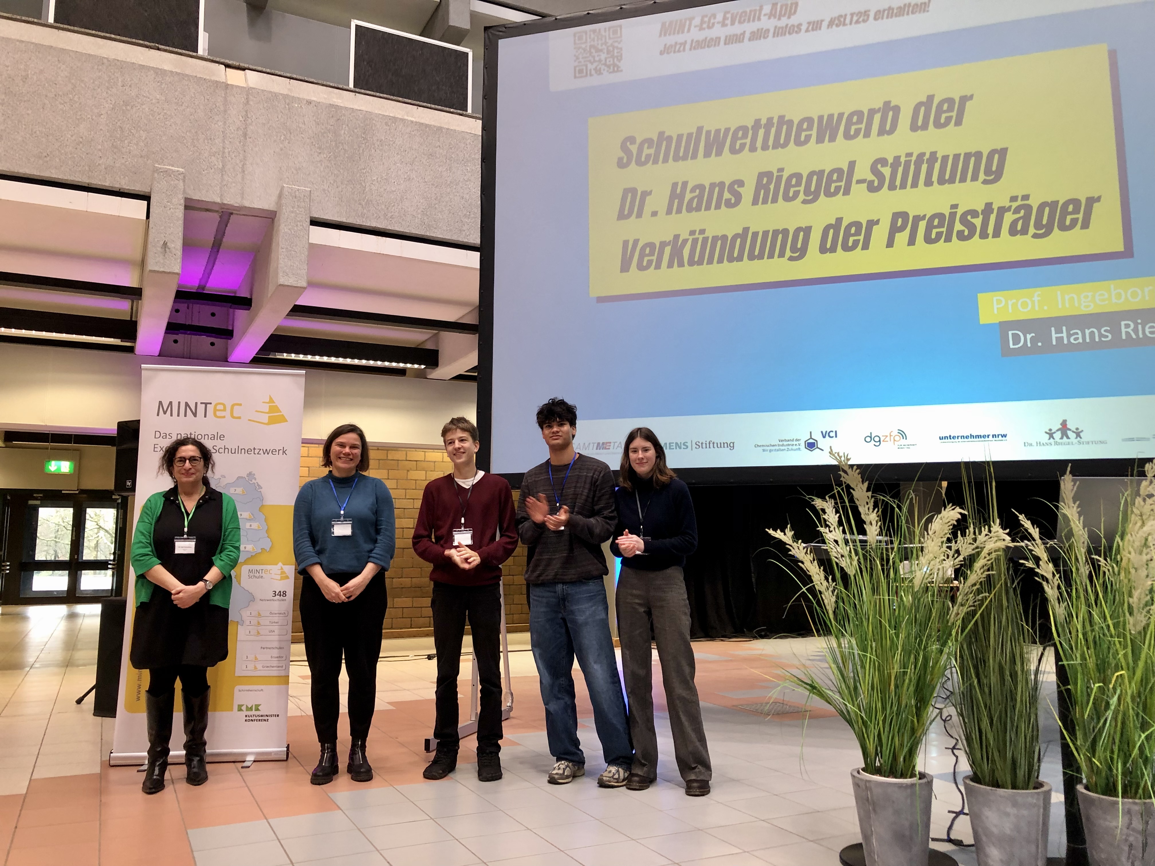 Unter dem Motto „Künstliche Intelligenz im Unterricht“ hatte sich Frau Dr. Ziomkowska mit ihrem Projekt „scienceCLASH – KI trifft Neurobiologie“ beworben. Gemeinsam mit den Schüler:innen Nuri (Q1), Helene und Till (Q3) präsentierte sie die Projektidee am Freitag auf der Bühne der Tagung. Nach einer Vorauswahl durch die Fachjury standen noch fünf Schulen im Finale. Unser Team überzeugte sowohl die Jury als auch das Plenum der rund 350 anwesenden Schulleiter:innen, und wurde am Samstag schließlich zu den bundesweiten Gewinnern erklärt. Die Dr. Hans Riegel-Stiftung fördert das Projekt mit 7000 € nun im kommenden Jahr, wodurch „scienceCLASH“ als innovatives Format der Wissenschaftskommunikation aus der Schule weiterentwickelt werden kann.