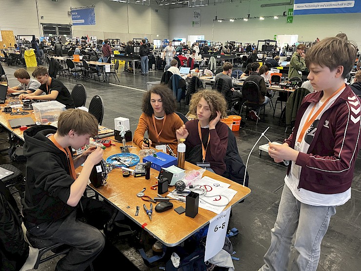 Am Sonnabend standen schließlich die letzten Wertungsläufe an, die besonders wichtig sind. Denn von den pro Roboter zu absolvierenden fünf Läufen wird für den Endstand der schlechteste Lauf gestrichen. Das sollte bei unseren Teams, wie bereits berichtet, ein Lauf des ersten Tages sein. Die Roboter liefen derart von unseren motivierten Schülern programmiert, kalibiriert und konstruktiv verbessert dann auch prima und holten die erhofften Punkte. Das Fußballteam '42' unserer vier Neuntklässler Jasper, Emil, Tobias und Bennett schaffte im Spiel gegen das Team des Tagore-Gymnasiums aus Berlin-Marzahn ein 5:5 Unentschieden bei mehrfach wechselnden Führungen. Ein vermeintliches 6:5 Siegtor fiel leider erst Sekundenbruchteile nach dem Spielende. Trotzdem stand ein versöhnlicher 13.Platz in der Abschlusstabelle.
