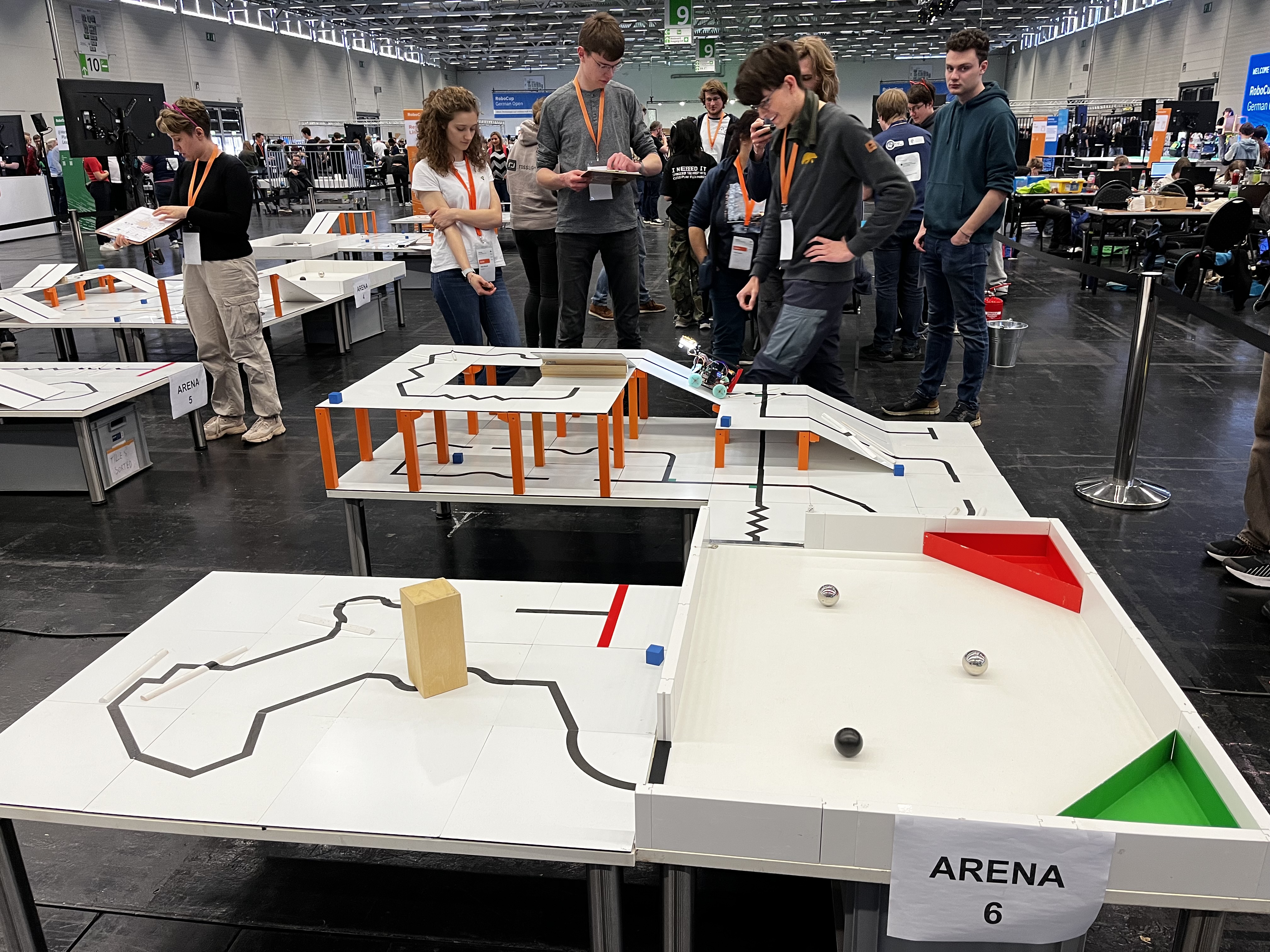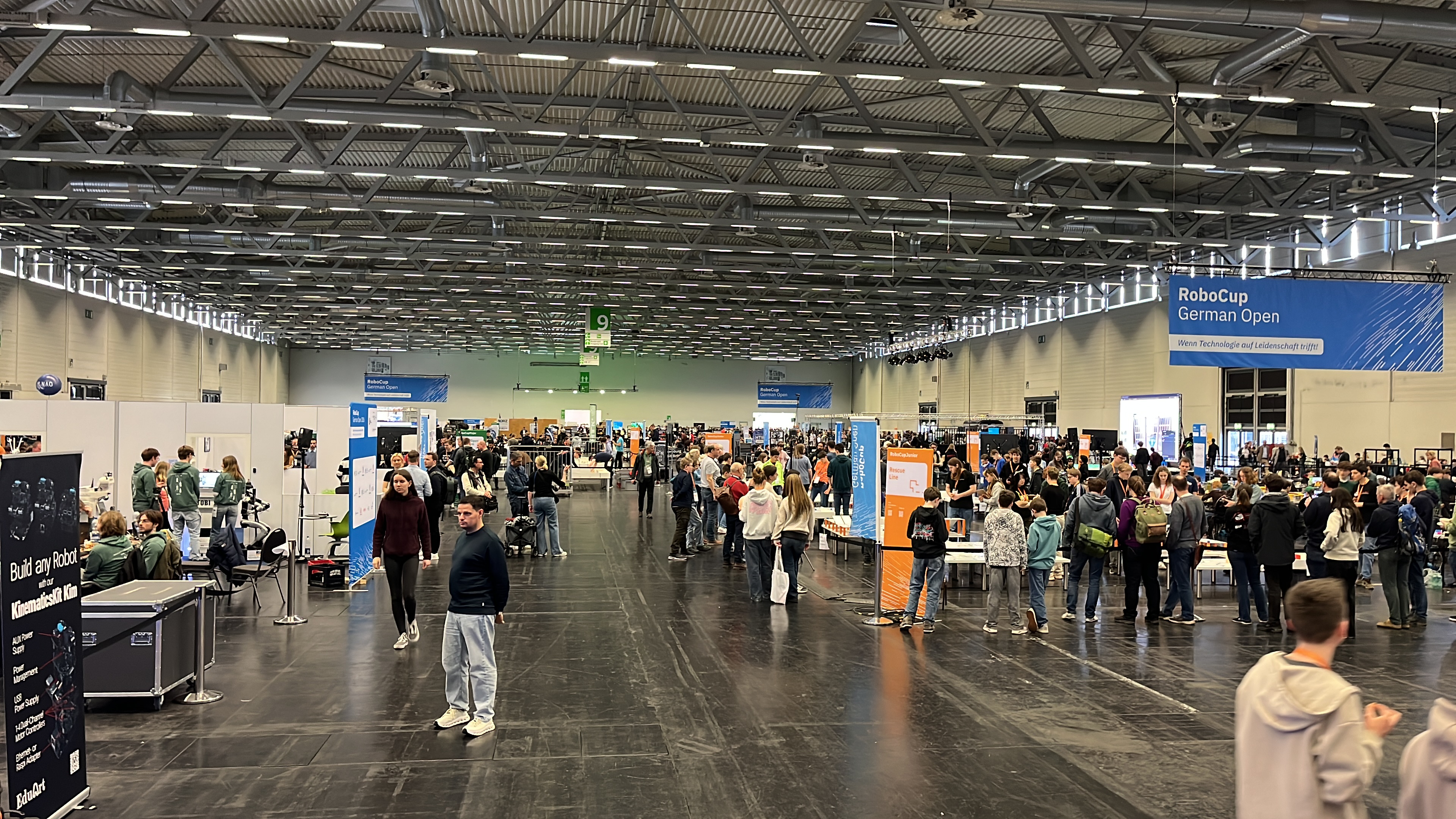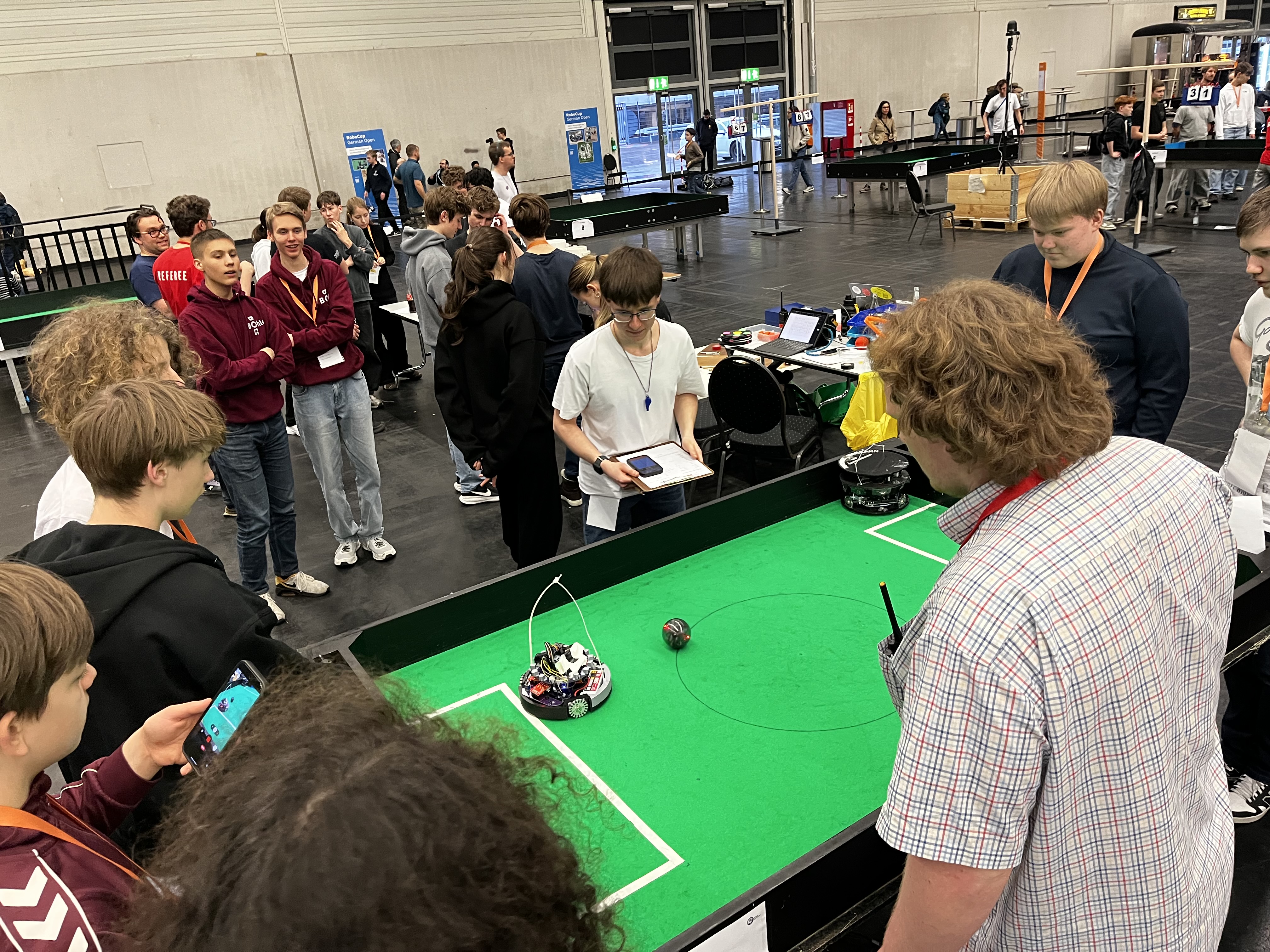 Mit 14 Schülern der Klassenstufen 6 bis 12 traten die vier für die deutsche Robocup-Meisterschaft qualifizierten Teams den Weg nach Köln mit der Bahn an. Der erste Eindruck am Mittwoch: Wow, so eine große Robocup-Halle hatten wir noch nicht gesehen. Über 200 Teams aus ganz Deutschland waren zusammen gekommen und außerdem war parallel zum Robocup auch die Bildungsmesse Didacta mit Ihren tausenden Besucher*innen in den Messehallen unterwegs. Sehr gut gelungen war in diesem Jahr die Mischung der Robocup-Senior-Wettwerbe der Student*innen mit den Junior-Wettbewerben der Schüler*innen in einer Messehalle.