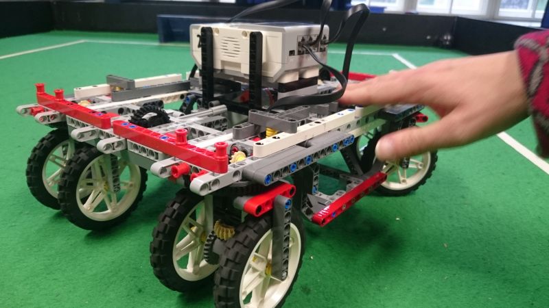 Das Gerät aus Standardlegoteilen muss in einer marsähnlichen Laborumgebung ein Analysegerät ferngesteuert millimetergenau an die zu untersuchenden Proben zu schaffen. Klar - ins Weltall wird das Gefährt sicher nicht kommen, der Umgang mit der Messtechnik muss aber vor dem Einsatz erst im Labor erprobt und verstanden werden.