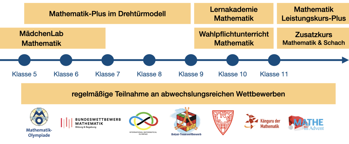 Ausgewählte Schüler*innen vertiefen im Drehtürmodell klassenübergreifend aktuelle Inhalte des Unterrichts, erweitern ihre mathematischen Kompetenzen (insbesondere Argumentieren und Problemlösen) und nehmen an zahlreichen Wettbewerben teil.